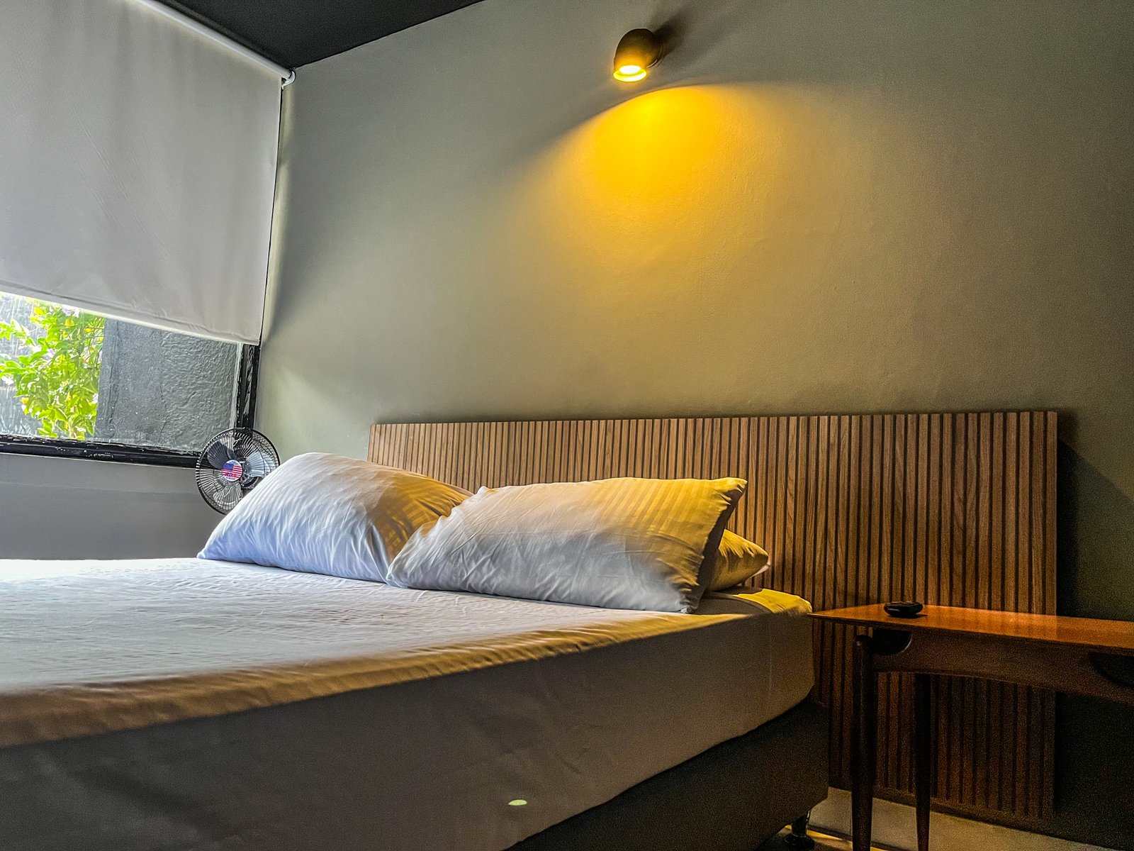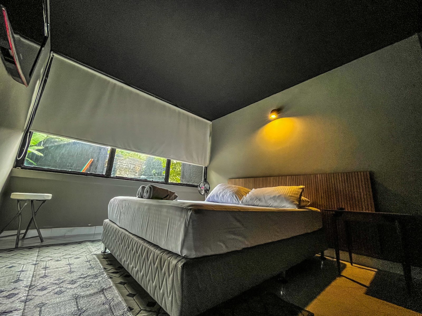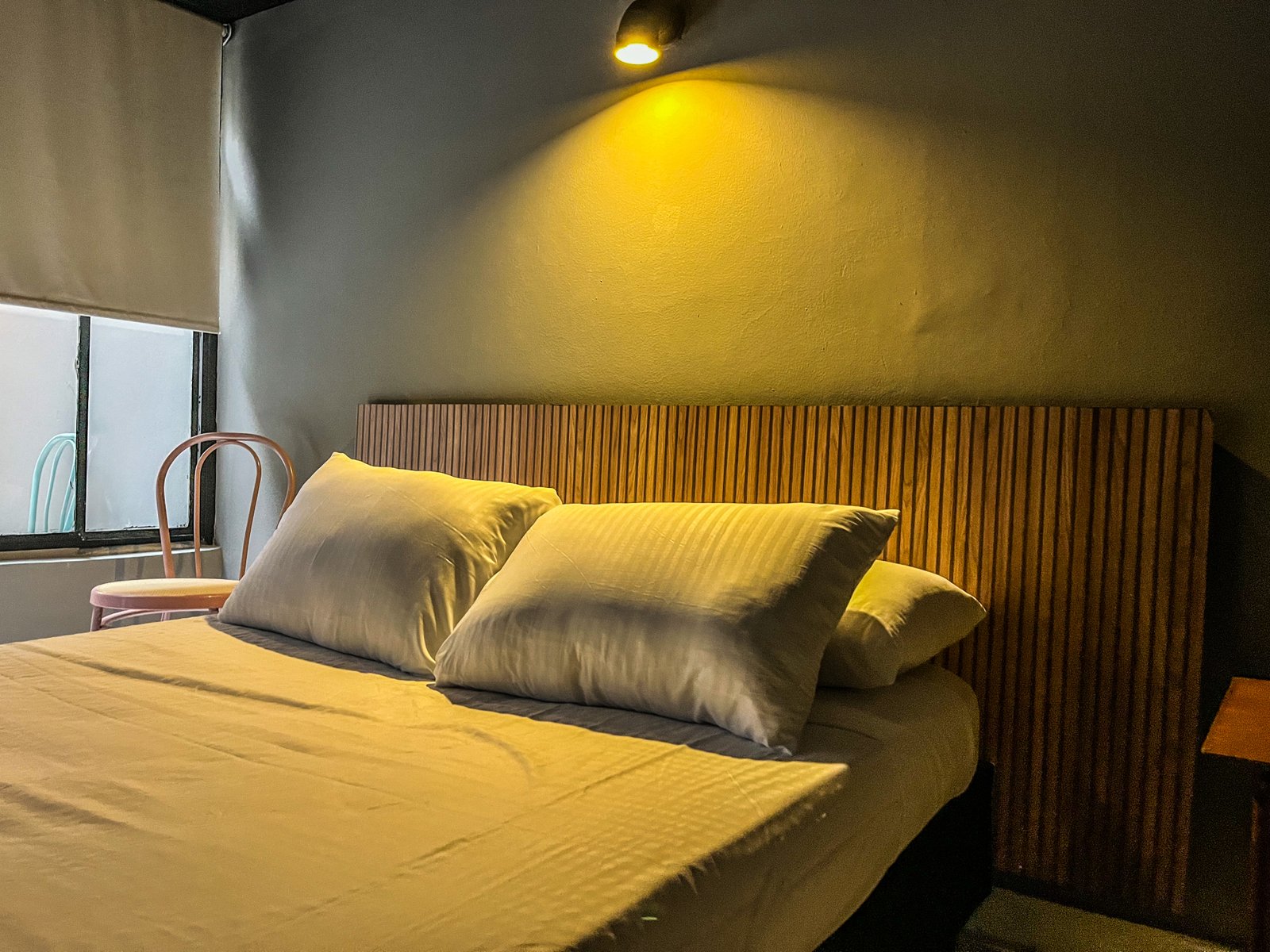 La habitación cuenta con una ventana con vista a un patio interno iluminado, lo que permite una buena ventilación y entrada de luz natural. También dispone de un pequeño espacio con sillas para mayor comodidad durante la estancia.